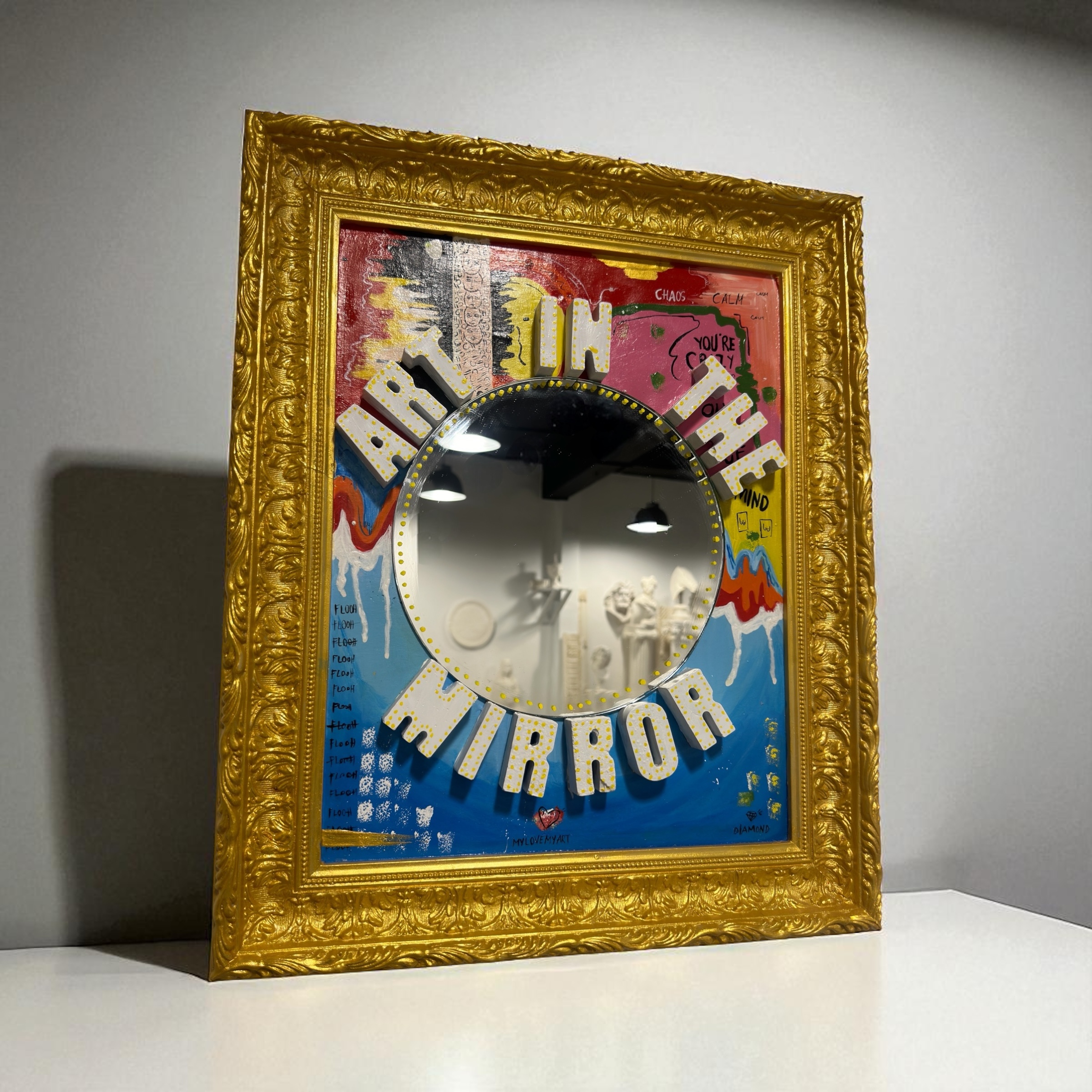Klasik ve modern sanatın birleşimini yansıtan bu özel tasarım tablo, altın varak görünümlü kabartmalı çerçevesiyle dikkat çekiyor. Ortasında yer alan yuvarlak ayna, izleyiciyi eserin bir parçası haline getiriyor.